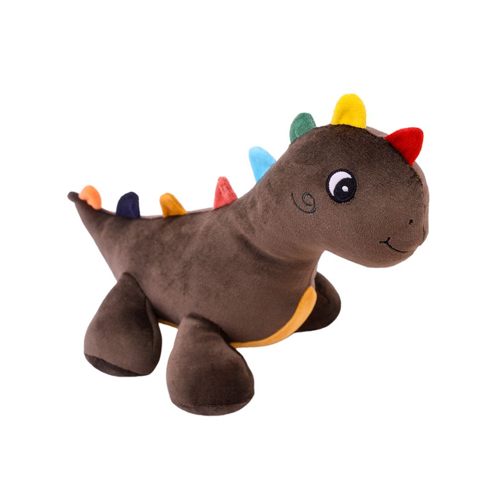Boneco de pelúcia em formato de dinossauro em plush com detalhes bordados. Na cor marrom com detalhes coloridos e barrinha bege.