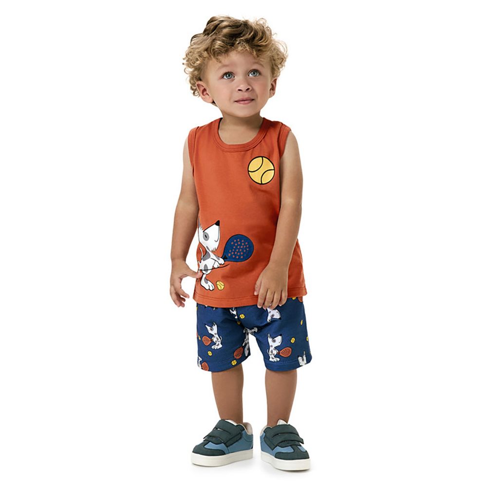 Conjunto Meninos Regata Laranja Cachorro Tenista e Bermuda Azul