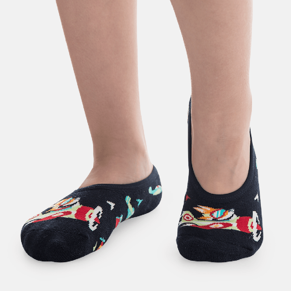 Meia meninos estilo sapatinho da marca Puket azul marinho estampa Raposa Piloto com sola antiderrapante.