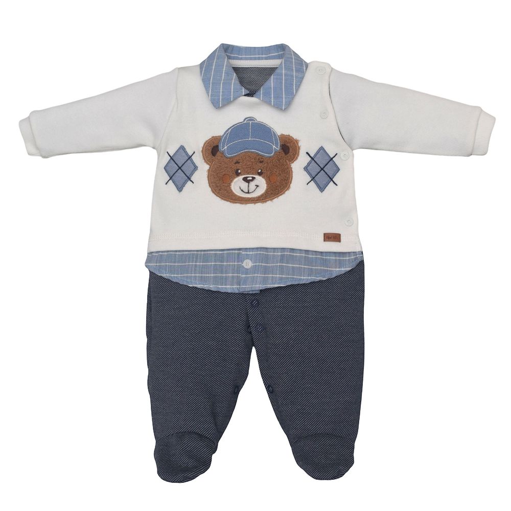 Tecido: tricô, malha algodão e jeans Composição: 67% algodão, 17% poliéster e 13% elastano Pés: Pés com meia (exceto no tamanho G); Abertura frontal: Botões de pressão; Abertura entrepernas: Botões de pressão. |